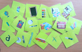 - running dictation: do kart proponuję dodać prawdziwe przybory szkolne i rozłożyć je na 4-5 stolikach,